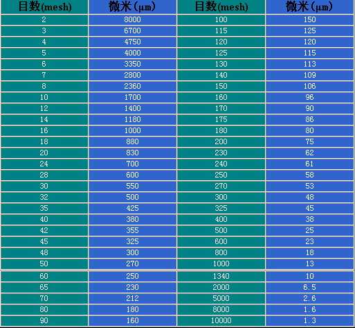 目數,就是孔數,就是每平方英寸上的孔數目。目數越大,孔徑越小。一般來說,目數×孔徑(微米數)=15000。比如,400目的篩網的孔徑為38微米左右;500目的篩網的孔徑是30微米左右。由于存在開孔率的問題,也就是因為編織網時用的絲的粗細的不同,不同的國家的標準也不一樣,目前存在美國標準、英國標準和日本標準三種,其中英國和美國的相近,日本的差別較大。我國使用的是美國標準,也就是可用上面給出的公式計算。