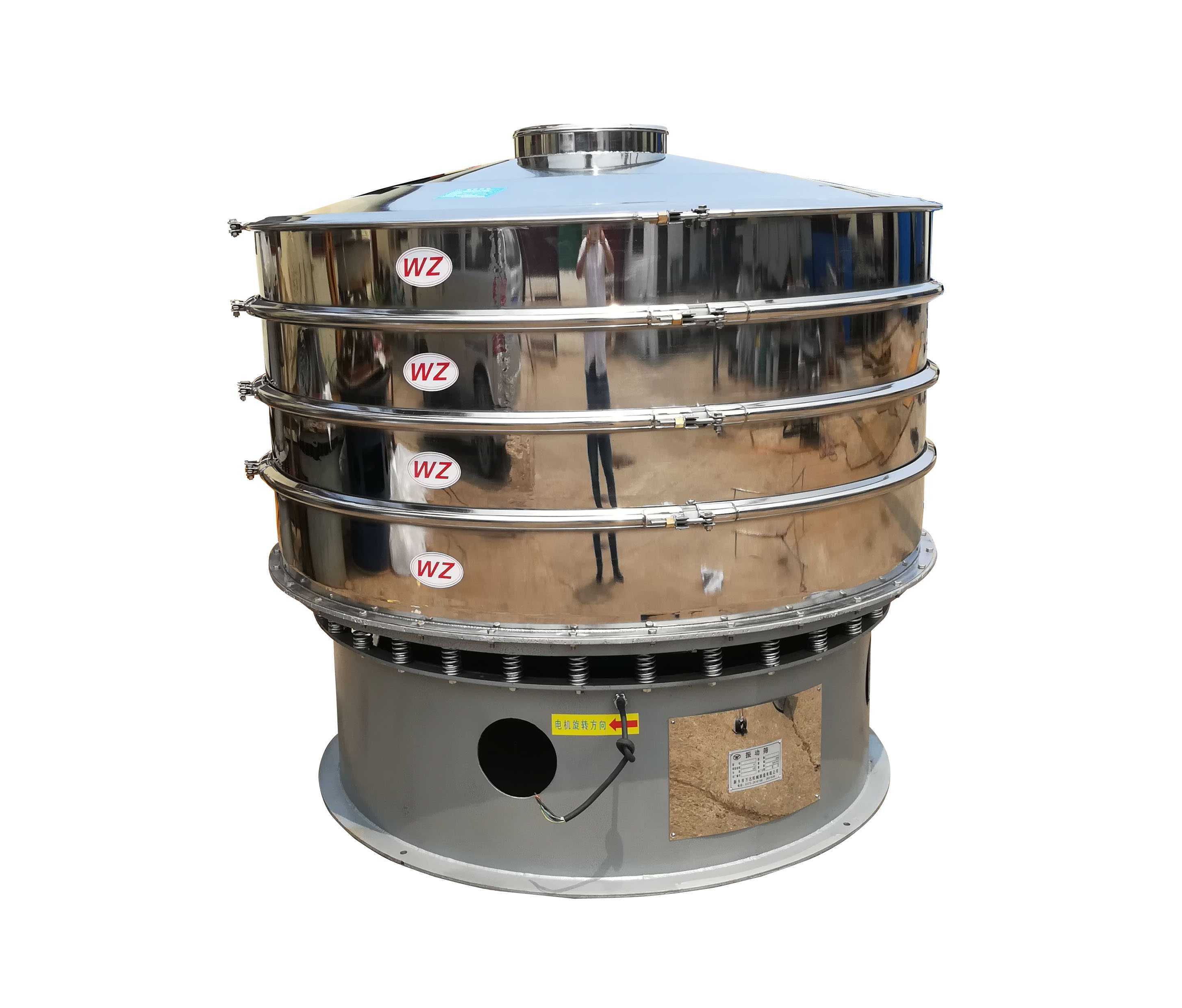 從用途方面進行區分,一般用于粉體類原料分級篩選時,旋振篩的偏心塊角度在出廠時就調整在70—80°范圍內,此時原料粉體在篩面上的運行速度較慢,篩分時間較長,原料顆粒在篩面上的運動路線最長,有利于小顆粒原料透篩,適用于原料的精細篩選。用于漿液類原料的過濾時,偏心塊角度一般在45°左右,此時漿液在機體內存有一定量,便于雜質等迅速過濾出來,漿液迅速透篩。